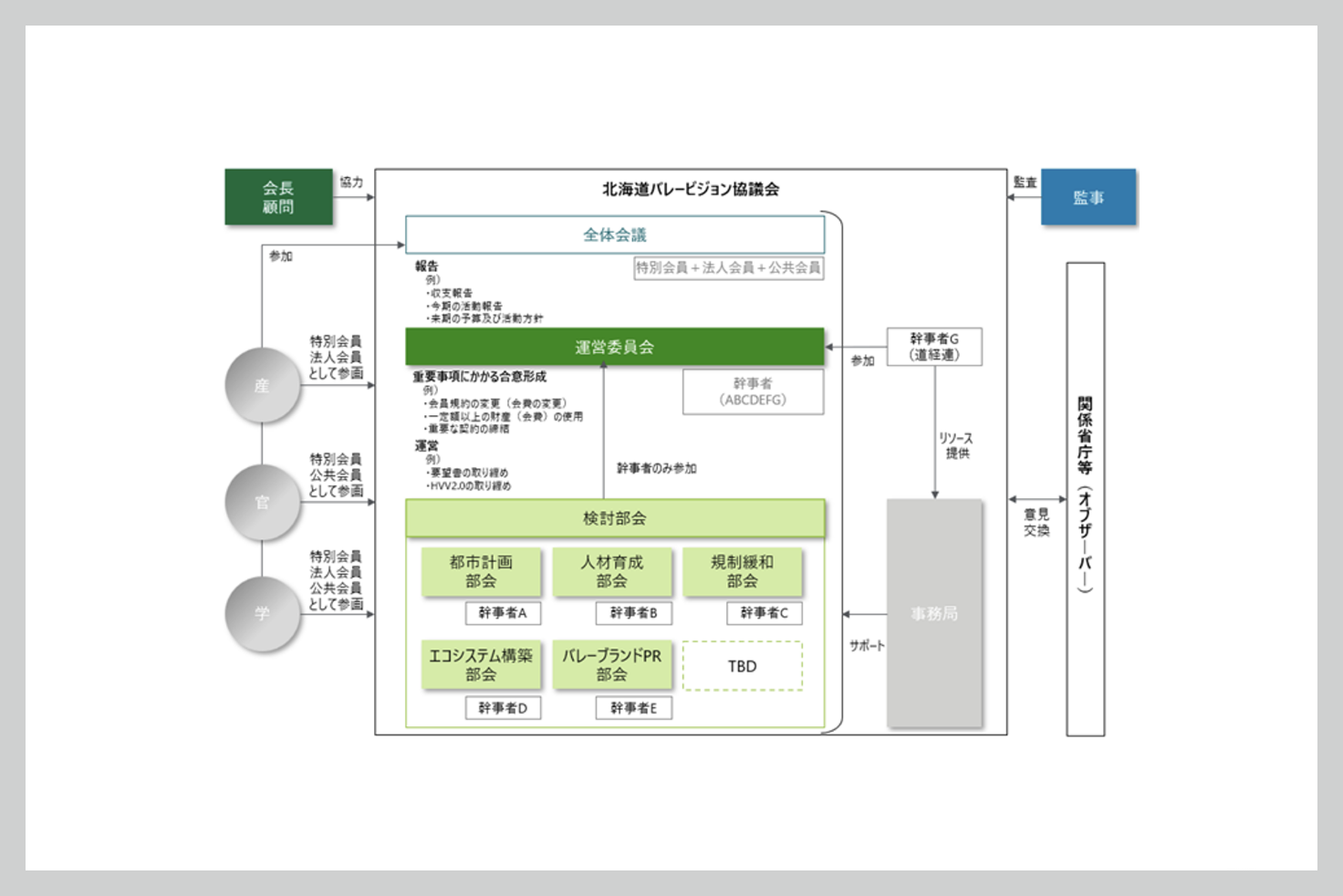 鹿山 北海道バレービジョン協議会を組成していく中、次の2点がポイントになったと考えています。第一に、投資計画策定や規制緩和検討、システム構築など専門的な議論を進める部会を設置したことでえば、インフラ整備一つをとっても非常に複雑です。学校の設置や規制の問題などがありまれらを一括で話し合うのは非効率的です。複数のコアとなる部会を立ち上げ、それぞれの部会で専門的な議論を進めています。